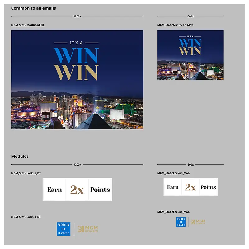 The process for these projects entailed creating tight layouts from supplied rough layouts. Deliverables for projects are pixel-perfect modules of any email section containing images, art, logos, etc. Retina resolutions are considered. Each module is a PNG file created from master layered and editable Photoshop files, which are then packaged for developers.