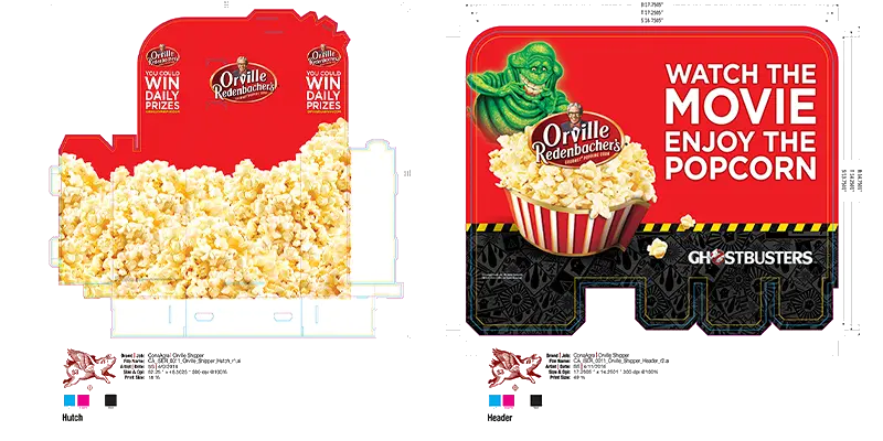 Shown here are two Marie Callender's shelf talkers and an Orville Redenbacher's shipper header and hutch.