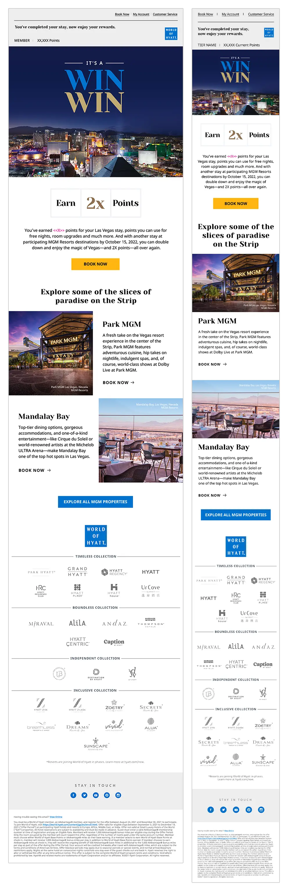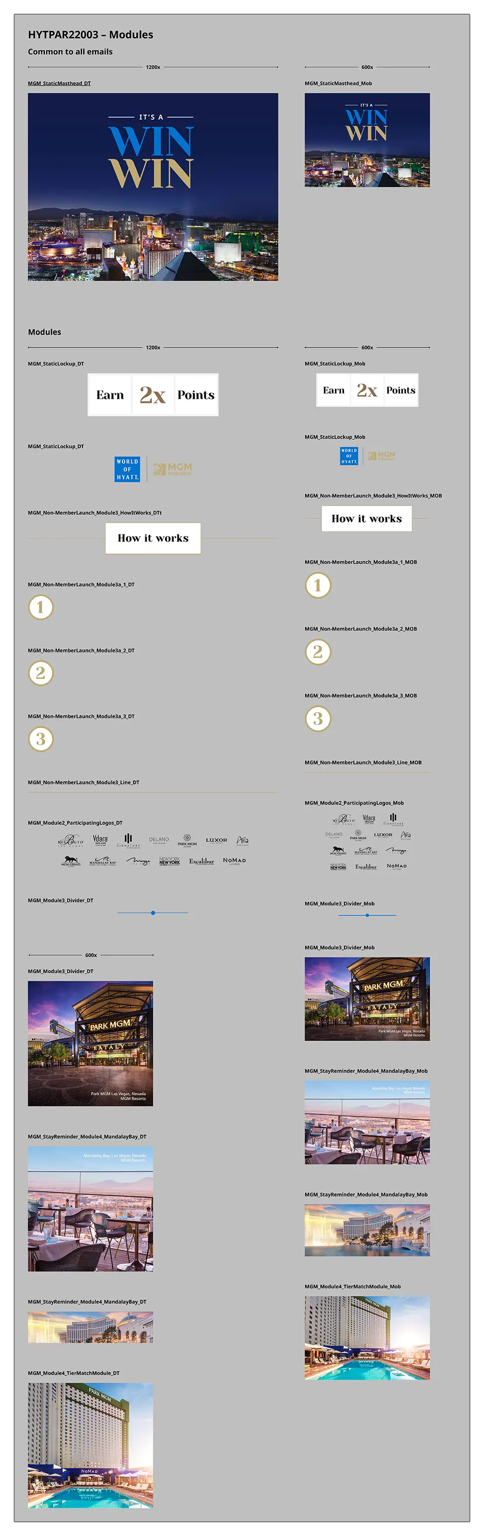 Hyatt digital campaigns range from very few pieces to many. Some projects included multiple emails targeting unique groups such as benefit members, nonmembers. Additional messaging included reminder emails, member benefit promotions, and versions for international resorts and hotels.